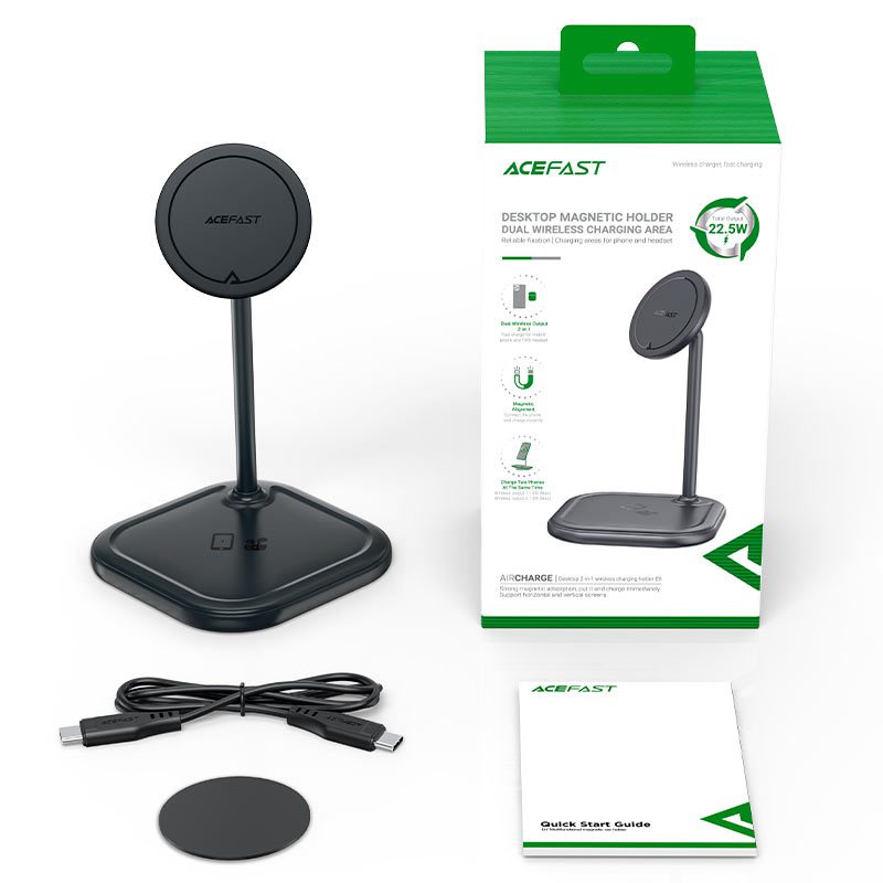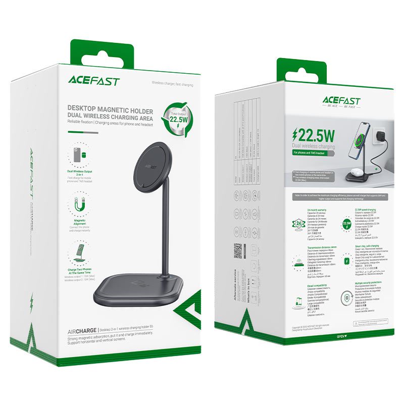 Acefast E6 Desktop 2in1 Wireless Charging Series є бездротовою зарядкою, яка дозволяє одночасно заряджати два пристрої без кабелів. Цей пристрій має металеву конструкцію та може використовуватися як настільна підставка для телефонів, планшетів та інших пристроїв, так і як зарядний пристрій для настільних комп’ютерів.