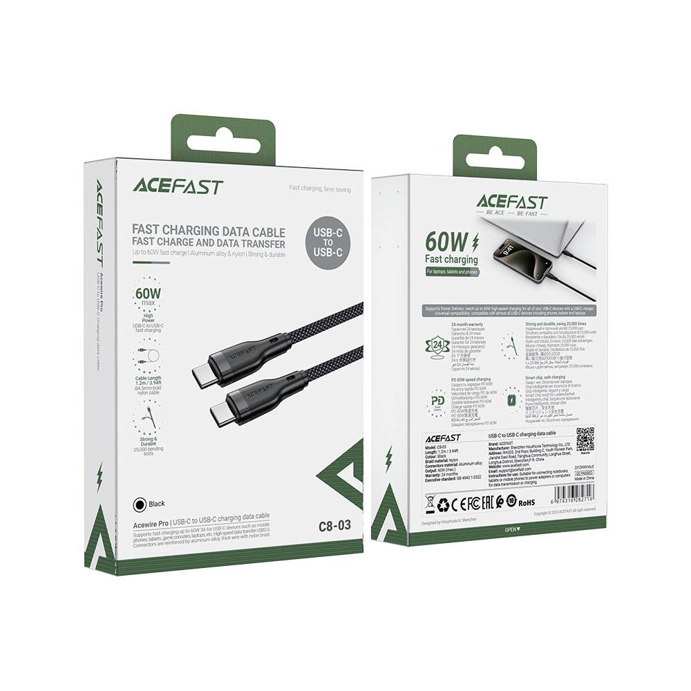 - Acefast також пропонує широкий вибір кабелів, включаючи USB-C до USB-C, USB-C до Lightning, USB до USB-C, USB до Lightning, а також AUX і кабелі для передачі даних.