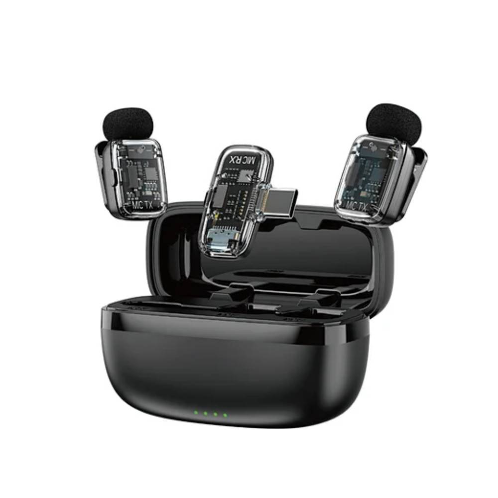 Модель оснащена двома бездротовими петличними мікрофонами, що дозволяє одночасно записувати звук з двох джерел — ідеально для інтерв’ю або спільного контенту. Система працює за технологією 2.4G, забезпечуючи стабільне з’єднання та передачу сигналу на відстані до 50 метрів без втрати якості.